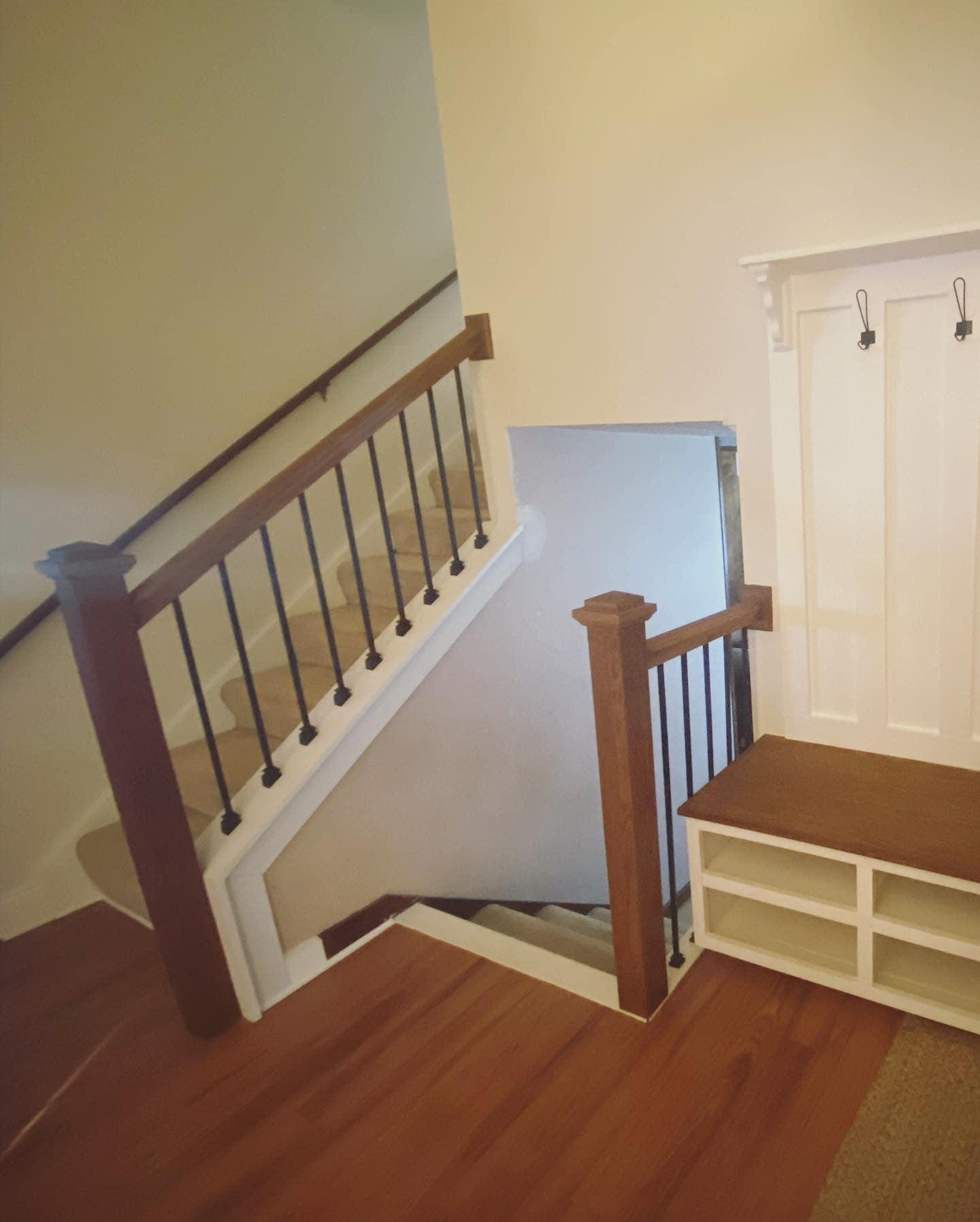 Custom hall tree with board and batten paneling, corbeled crown shelf, stained oak bench top, and shoe cubbies — paired with a full staircase railing upgrade featuring stained oak newel posts, oak handrail, and matte black iron balusters carried from the bottom landing through the second floor.
