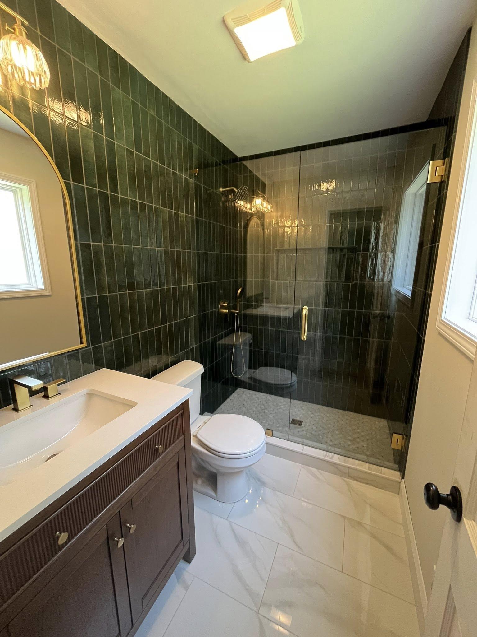 Complete bathroom gut-and-rebuild transforming a dated space into a designer-level retreat. Features forest green zellige-style tile, walk-in shower with frameless glass enclosure, brushed gold fixtures, fluted espresso vanity with white quartz top, and pebble tile shower floor.